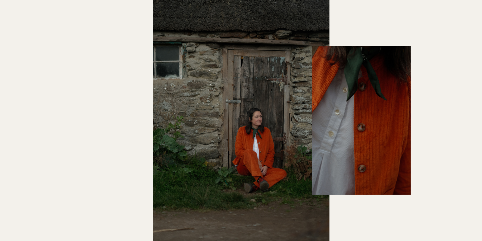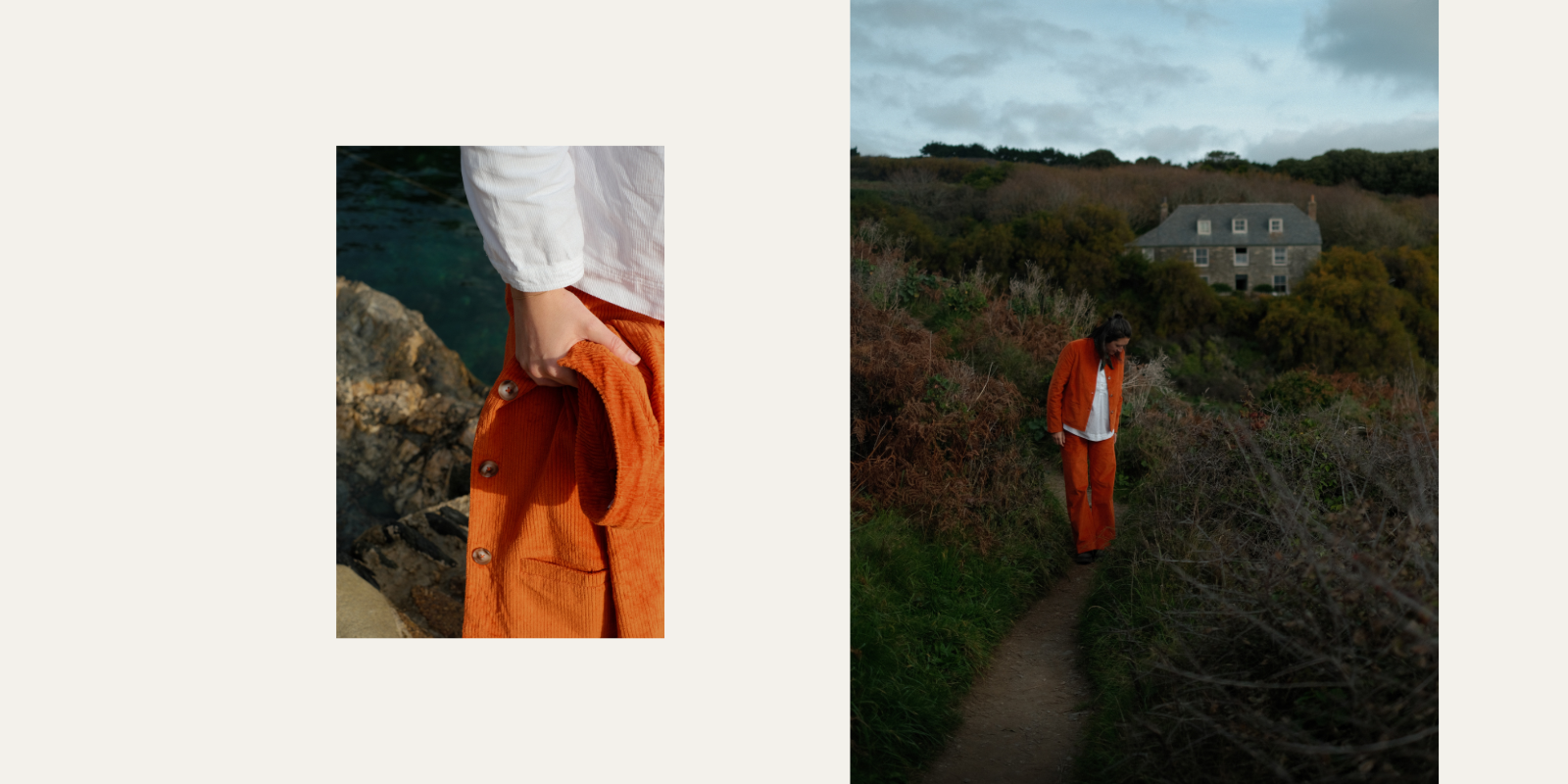 A suit is a staple in most wardrobes, and this cord version is so easy to wear. The orange adds a playfulness to autumnal dressing and honestly, why not stand out a little? I wore it stomping along the Cornish coast in walking boots and cosy socks, layered over the Alba shirt for a relaxed weekend look that’s just as at home on a dog walk as it is at lunch.As the weather cools, throw on the cashmere hoodie underneath for a more laid-back, layered feel. To dress it up, one could pair it with the Edwardian blouse, the frilled collar and cuffs peek out just perfectly from the jacket, giving it a softer, more feminine edge.