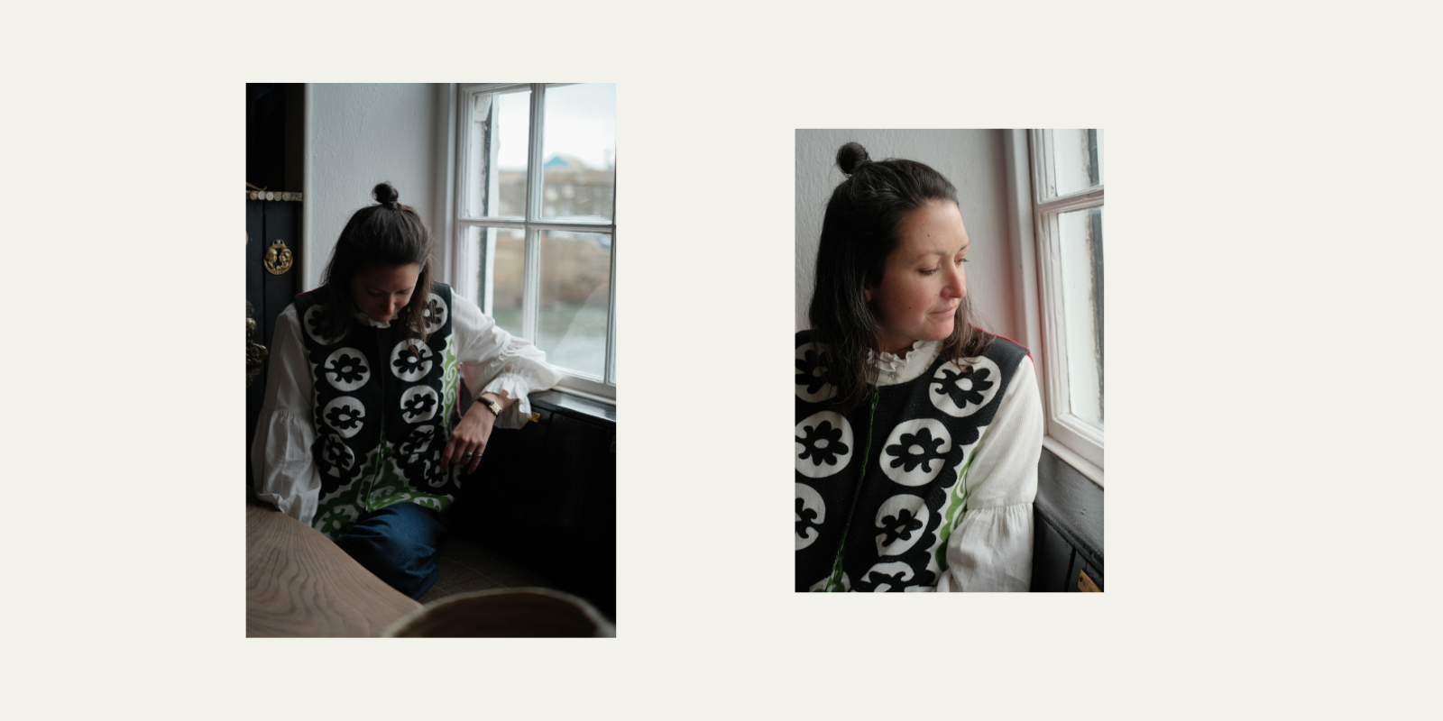 The embroidered waistcoat is a standout for me this season, I love the colours and the pattern. I style it with the Edwardian shirt to show off those amazing puff sleeves and the frill details at the collar and cuffs. It looks beautiful with the Gigi trousers for a smarter take, or you can dress it down with denim which is how I enjoyed wearing it. The Felix trousers are a dream to wear. The loose fit is incredibly comfortable, and they look great with everything from knitwear to shirts, trainers to loafers.