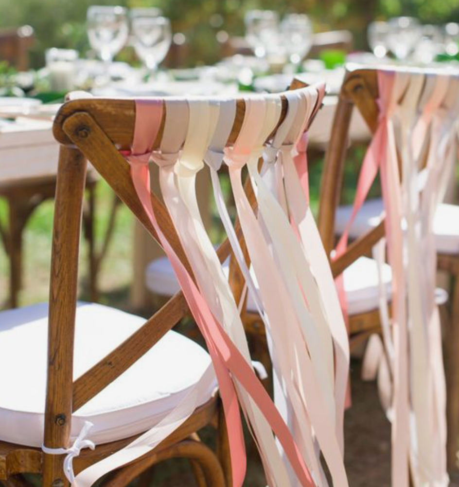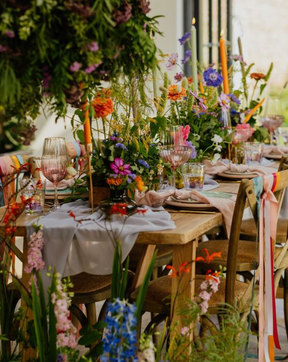 "Wildflowers and lavender. On my travels I picked up some gorgeous block print tablecloths from Jaipur, we will use these on long wooden tables, with colourful ribbon attached to our chairs."