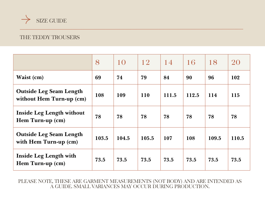 A gentle wide leg with a turn up hem, which can be let down for extra length.