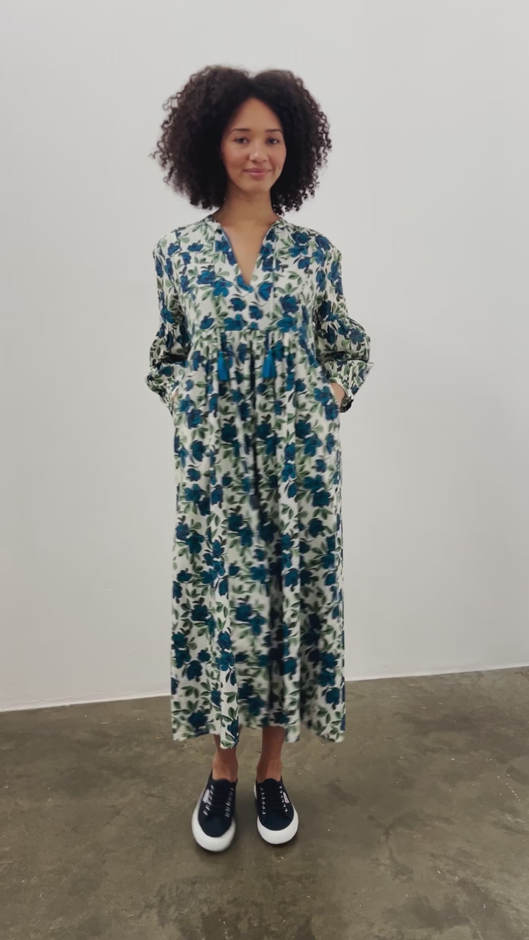 With a relaxed boho vibe, the Imogen is a real joy to wear given the easy fit. With contrasting tassel details, full length sleeves and fully lined in cotton voile, it's a hard working dress that effortlessly goes from day to night. Available in our cotton voile Blue Check or our cotton floral print.