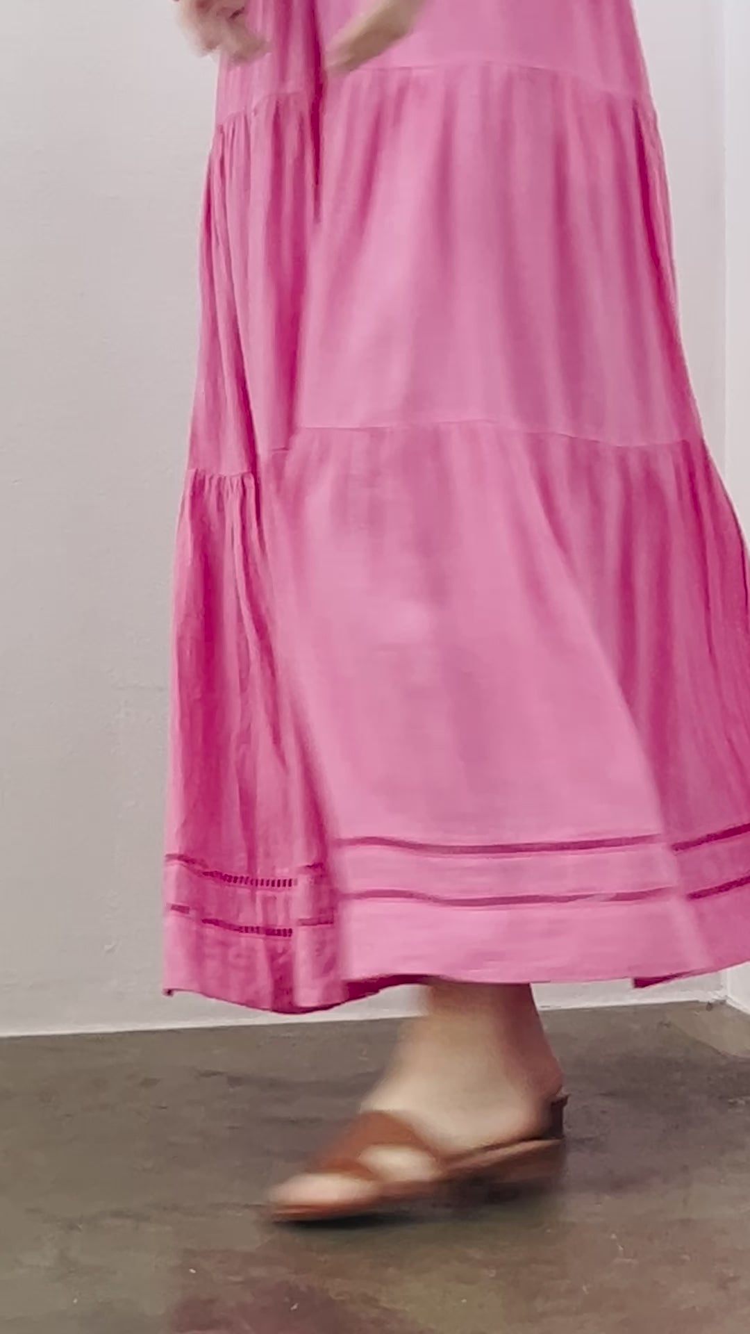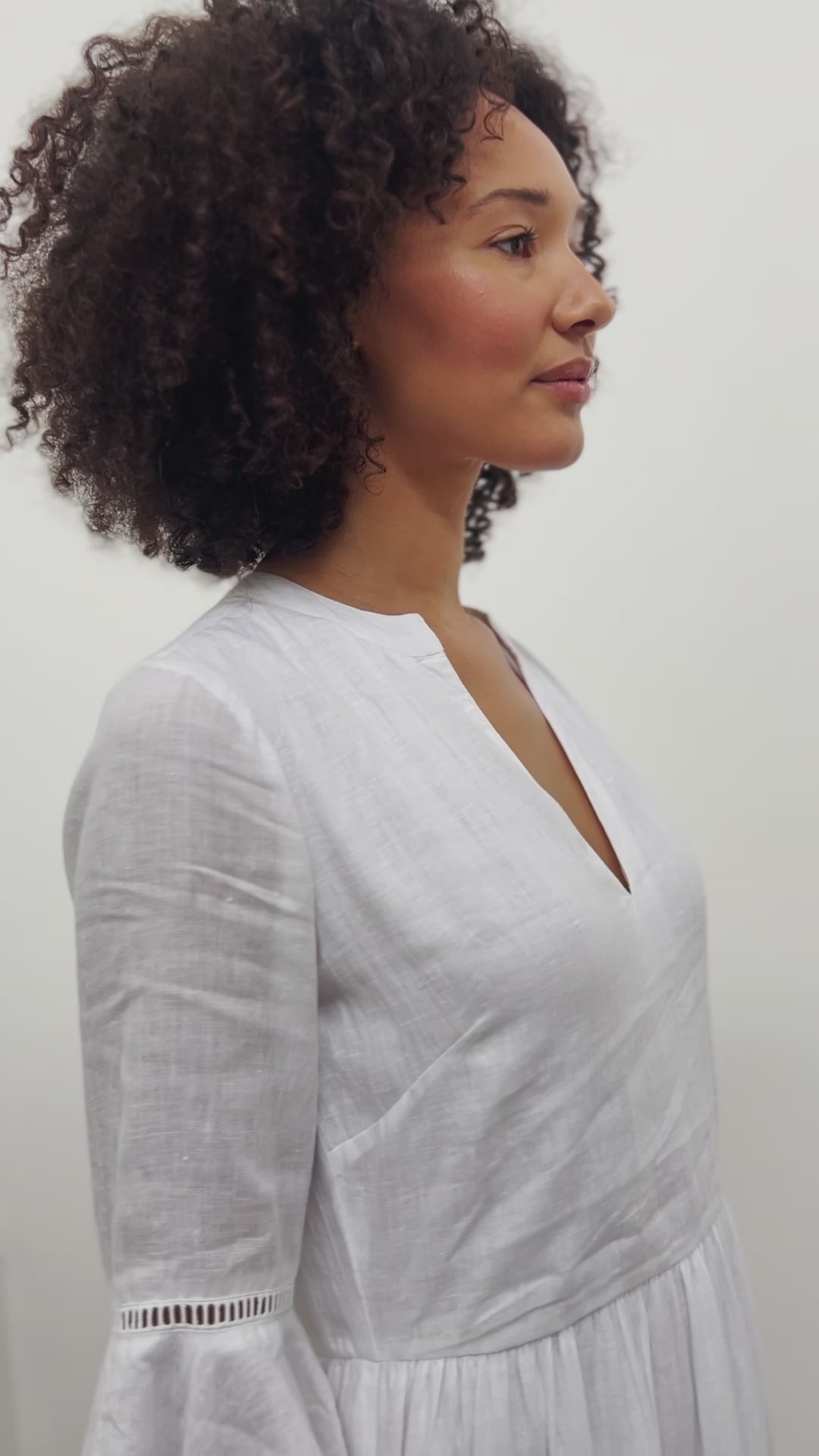 The Rosie Dress flew out last year so is back for the new season. Our beautiful longer length cascading dress with a tiered skirt. With a simple V neck and flowing 3/4 length sleeves. The ladder stitch detail at the hem and sleeves complete this statement dress.